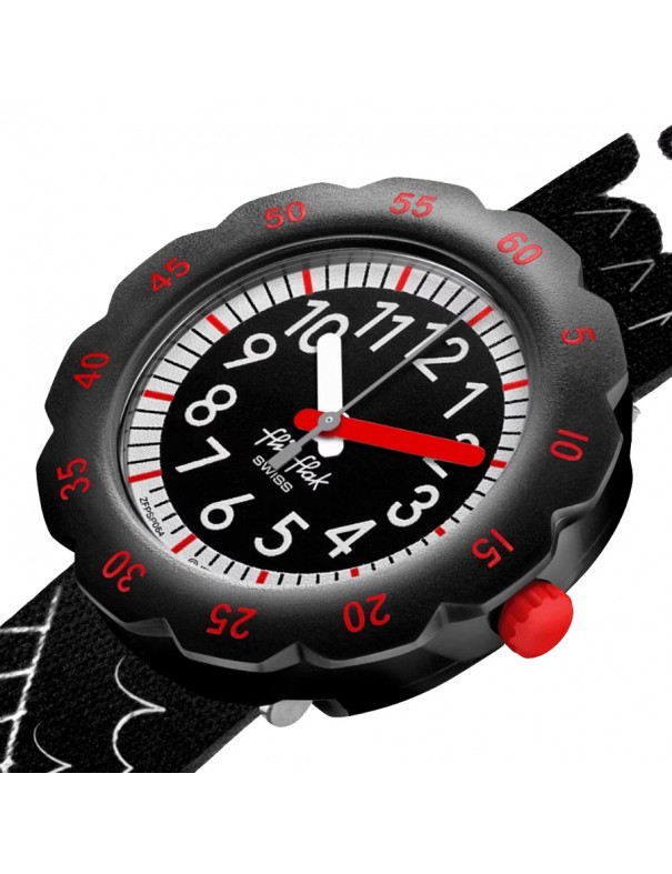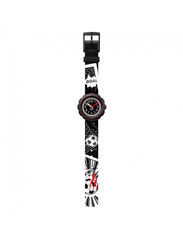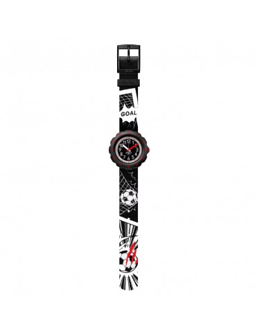 Reloj FLIK FLAK Goal FPSP064. Cuenta con caja de plástico de origen biológico en color negro y esfera negra con números blancos. Correa textil reciclada con diseño futbolístico y cierre de hebilla. Movimiento de cuarzo suizo analógico. Resistente al agua hasta 3 bar.