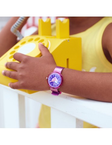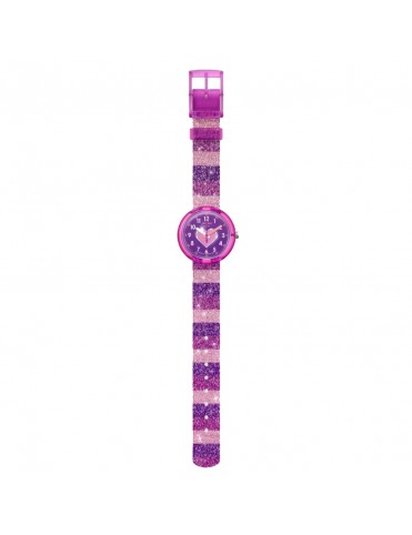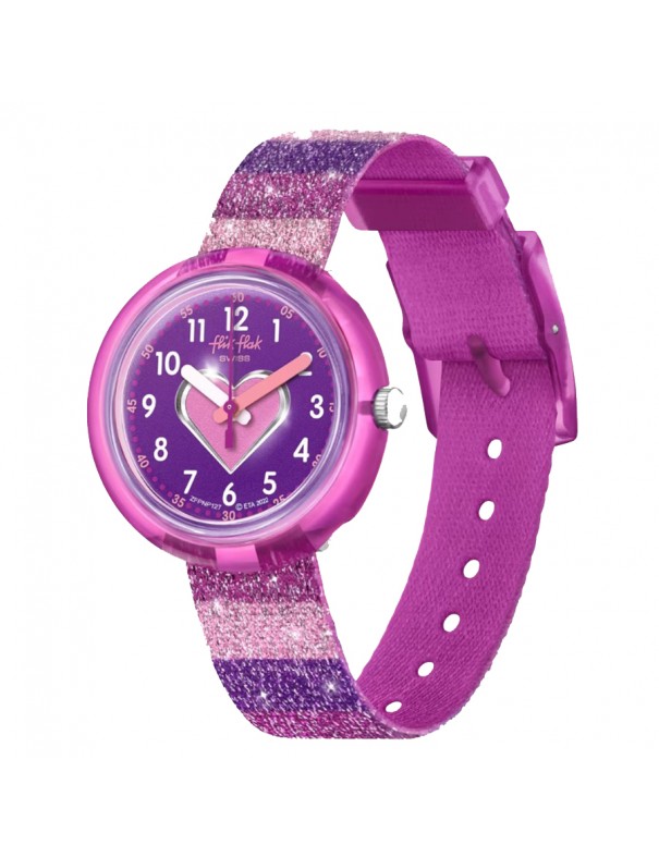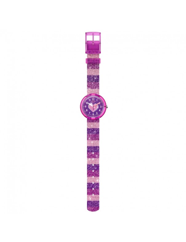Reloj FLIK FLAK Stripy Glitter FPNP127. Cuenta con caja de plástico de origen biológico en tono rosa transparente y esfera violeta con corazón rosa. Correa de textil reciclado rayada y brillante con cierre de hebilla. Movimiento de cuarzo suizo con función de hora. Resistente al agua hasta 3 bar. Garantía de 3 años.