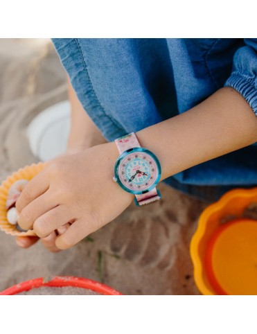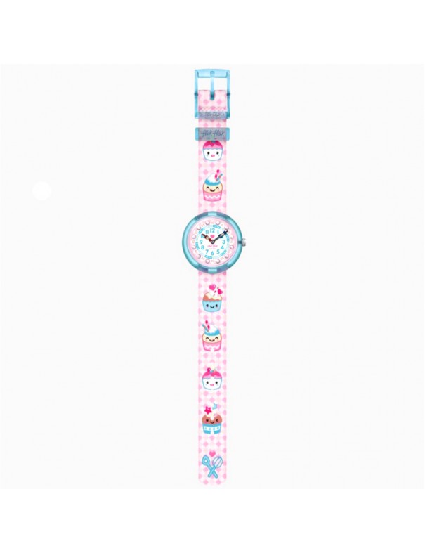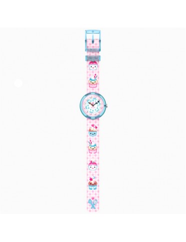 Reloj FLIK FLAK Bake It Up FBNP219. Cuenta con caja de plástico biológico azul con esfera rosa, correa de textil reciclado con cierre de hebilla; movimiento de cuarzo suizo analógico de dos agujas, y resistencia al agua de 3 bar. Garantía de 3 años.