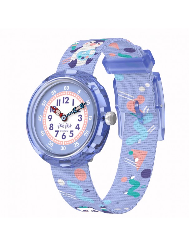 Reloj Flik Flak Arty Animals FBNP246. Reloj infantil con caja redonda de plástico de origen biológico color violeta y correa textil reciclado multicolor con motivos de animales y cierre de hebilla, ideal para niños. Incorpora movimiento suizo de cuarzo analógico con esfera blanca/violeta de fácil lectura.