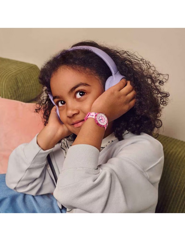 Reloj Flik Flak Karaokee FPNP171. Reloj infantil con caja redonda de plástico de origen biológico rosa con esfera rosa y blanca, correa textil rosa de PET reciclado con motivos de karaoke y cierre de hebilla. Cuenta con mecanismo de cuarzo suizo. Es resistente al agua hasta 3 ATM. Garantía de 3 años.