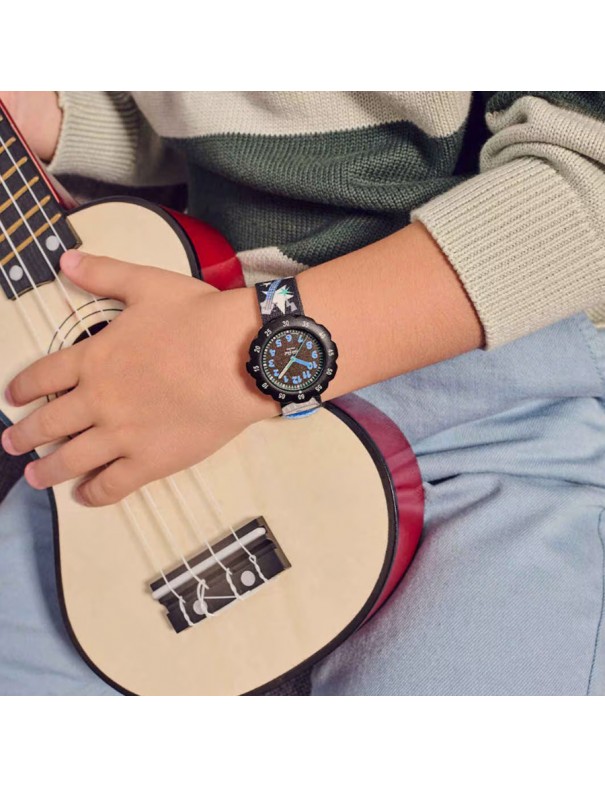 Reloj Flik Flak Stage Star FPSP077. Reloj infantil con caja redonda de plástico de origen biológico negro y esfera analógica negra con detalles coloridos, correa textil de PET reciclado negra con motivos musicales y cierre de hebilla. Resistente a salpicaduras hasta 3 ATM. Garantía de 3 años.
