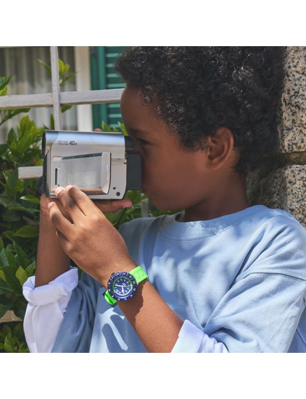 Reloj Flik Flak Neobrick FCSP132. Reloj infantil con caja redonda de resina/plástico azul, correa de silicona verde neón con cierre de hebilla, esfera analógica con números blancos y manecillas de colores. Es resistente a salpicaduras hasta 3 ATM.