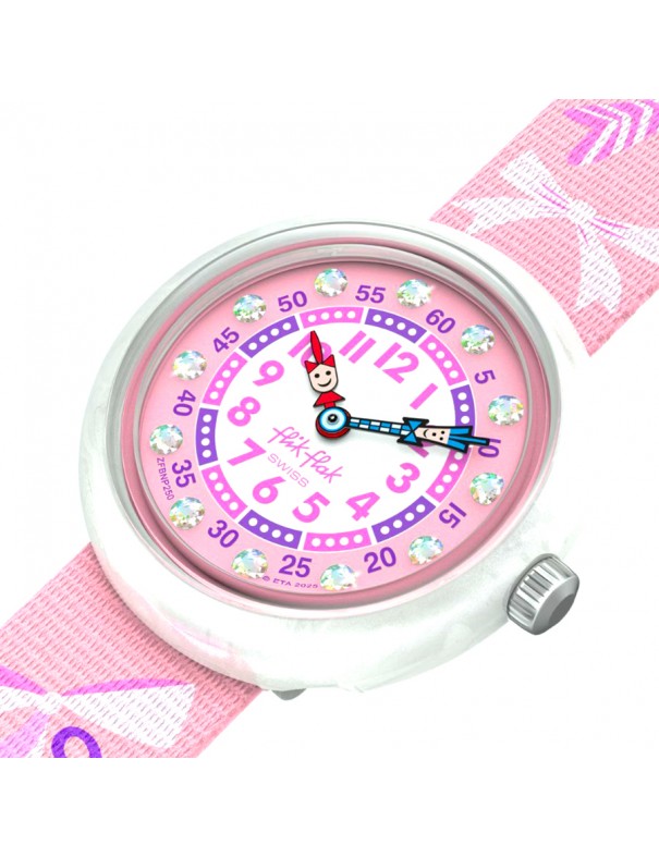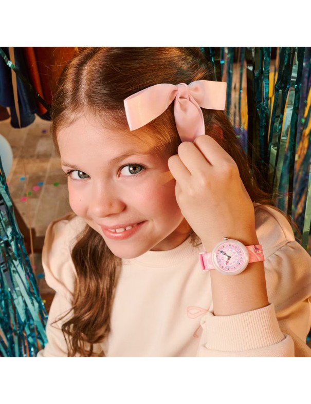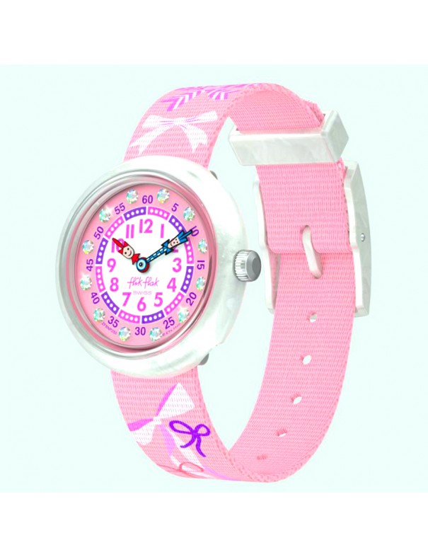 Reloj Flik Flak Pick a Bow FBNP250. Reloj infantil con caja redonda de plástico de origen biológico color blanco y correa textil reciclado rosa con motivos de lazos y cierre de hebilla blanco. Es analógico y resistente a salpicaduras hasta 3 ATM.