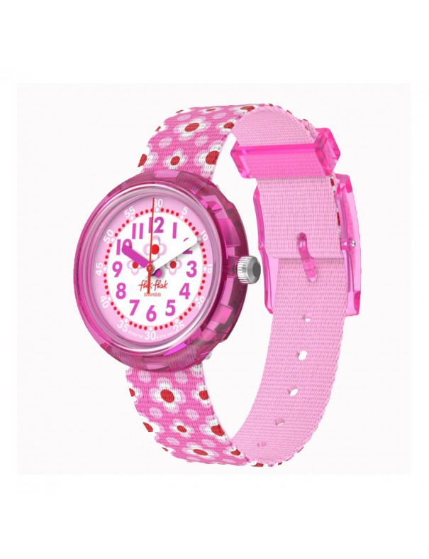 Reloj Flik Flak Flower FPNP180. Reloj infantil Swiss Made diseñado para hacer que el aprendizaje de la hora sea divertido y lleno de estilo, con un alegre motivo floral en tonos rosa y detalles de colores que captan la atención de los niños; cuenta con un movimiento de cuarzo suizo de alta precisión protegido por un cristal acrílico resistente a salpicaduras (3 ATM) y una caja ligera de plástico de origen biológico que aporta durabilidad y confort para el uso diario. Su correa textil de PET reciclado en rosa con cierre de hebilla ofrece ajuste cómodo para muñecas infantiles, mientras que los números grandes y manecillas contrastadas facilitan la lectura analógica de la hora.