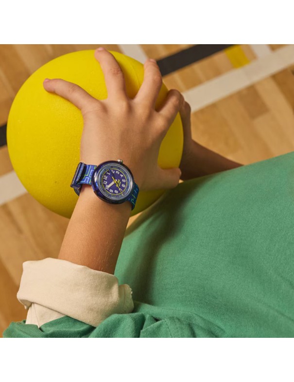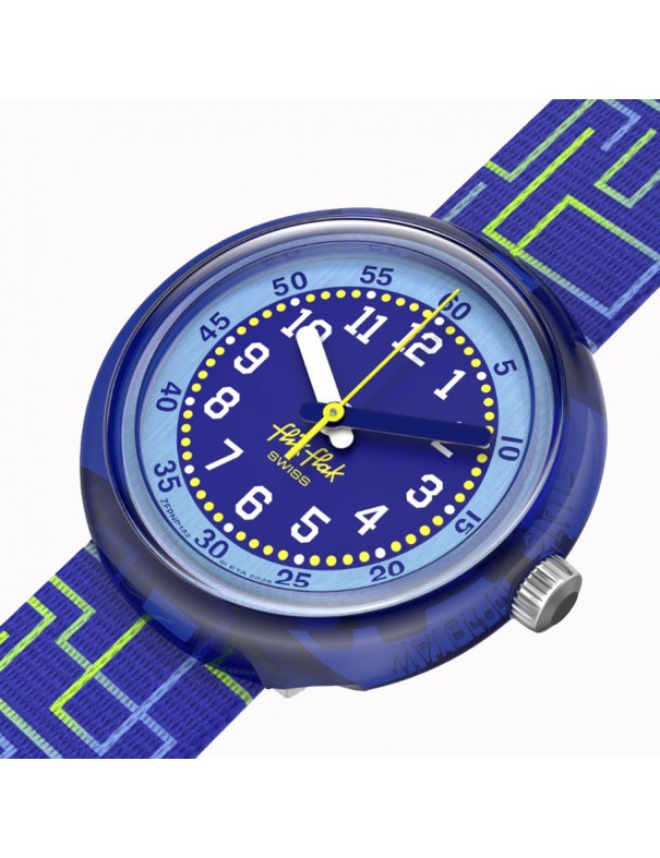 Reloj Flik Flak Crazy Maze FPNP182. Reloj infantil analógico Swiss Made con un diseño inspirador que combina un laberinto amarillo y azul sobre un fondo azul intenso para despertar la imaginación de los pequeños exploradores mientras aprenden a leer la hora con claridad; incorpora un preciso movimiento de cuarzo suizo, una caja ligera de plástico de origen biológico con cristal acrílico resistente a salpicaduras (3 ATM) y una correa textil de PET reciclado con cierre de hebilla que ofrece comodidad y durabilidad para el uso diario. Este modelo educativo y divertido no solo facilita el aprendizaje del tiempo con números y manecillas contrastadas, sino que también combina estilo, robustez y materiales seguros, convirtiéndolo en un regalo ideal para niños y niñas.