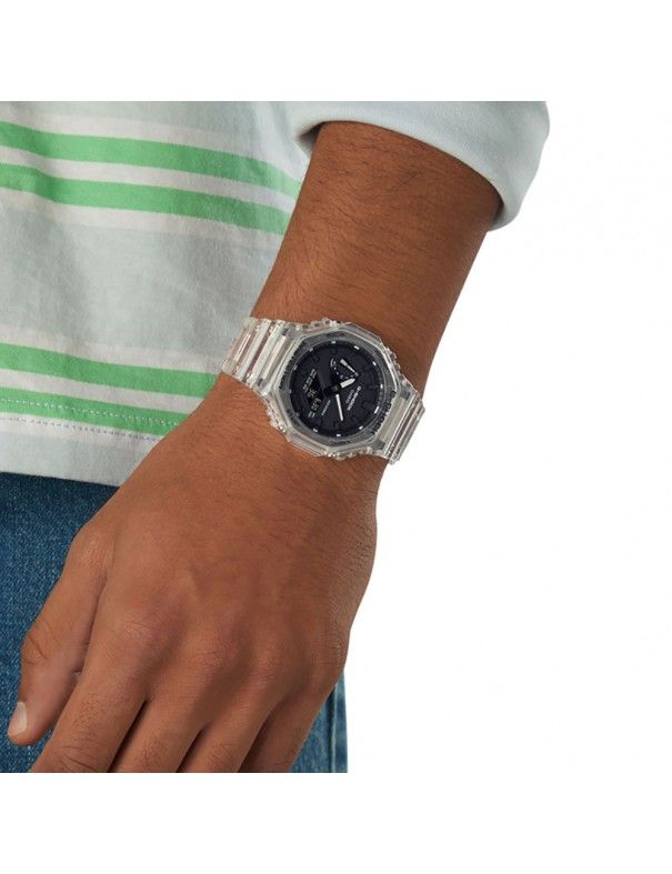Reloj Casio G-Shock GA-2100SKE-7AER, analógico y digital con agujas luminiscentes. Caja de 48X45mm transparente de resina reforzada con carbono. Pulsera de resina transparente. Función de 5 alarmas, cronómetro, temporizador, función de hora universal, calendario automático, indicador de hora en formato 12/24horas, pantalla de neón y luz led. Sumergible a 20ATM, por lo que es apto para ducha y baño con inmersión (inmersión con botella).
