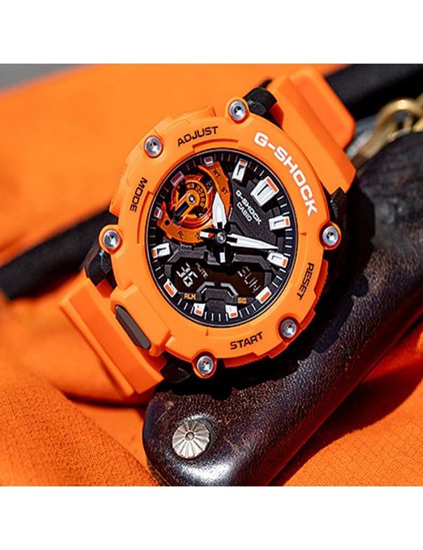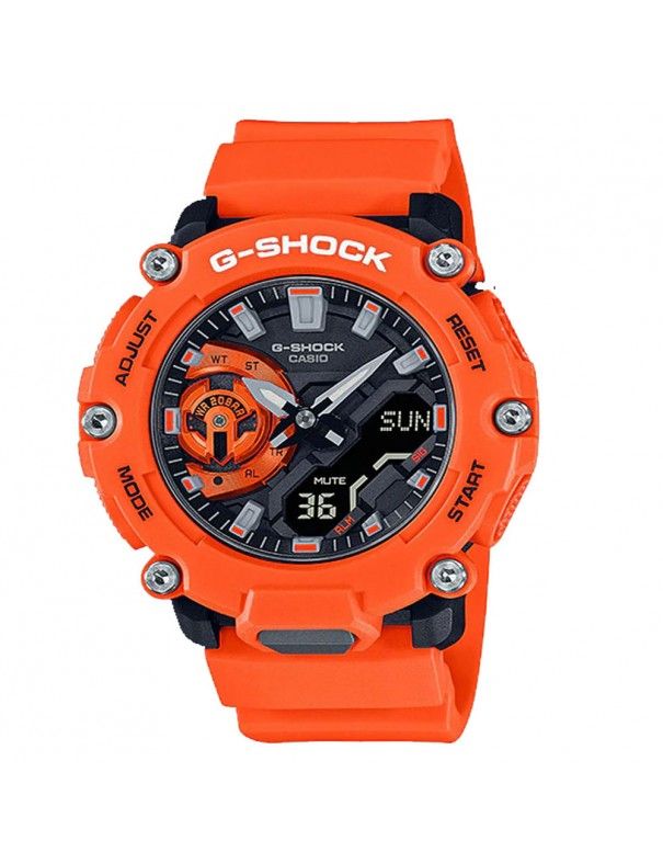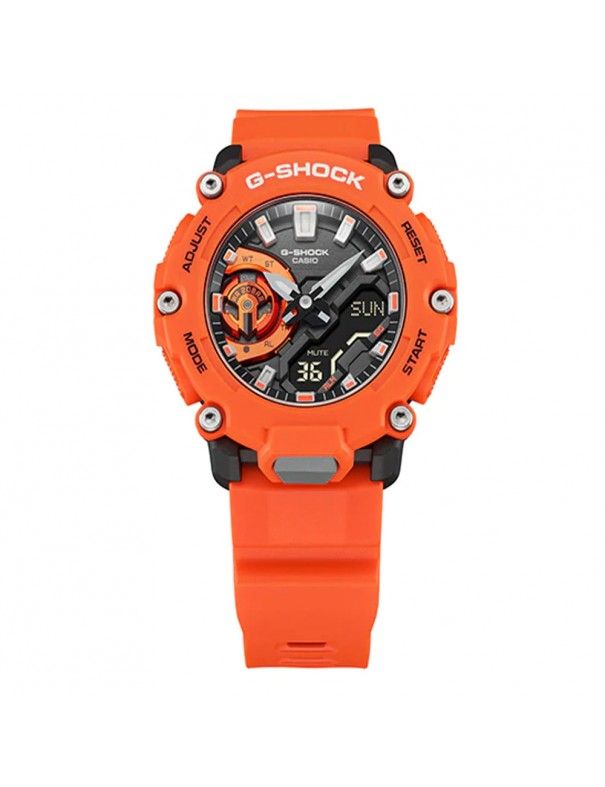 Reloj Casio G-Shock GA-2200M-4AER, analógico y digital. Caja de resina reforzada con carbono de 47mm de diámetro. Cristal mineral y pantalla de neón. Función de 5 alarmas, cronómetro, temporizador, hora universal, caledario automático, formato 12/24 horas. Correa de resina.