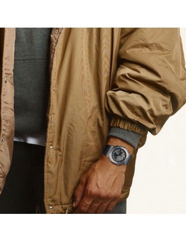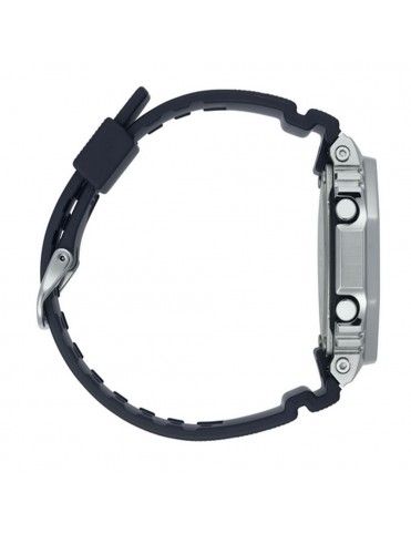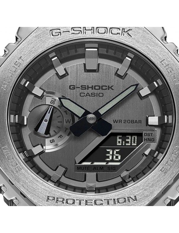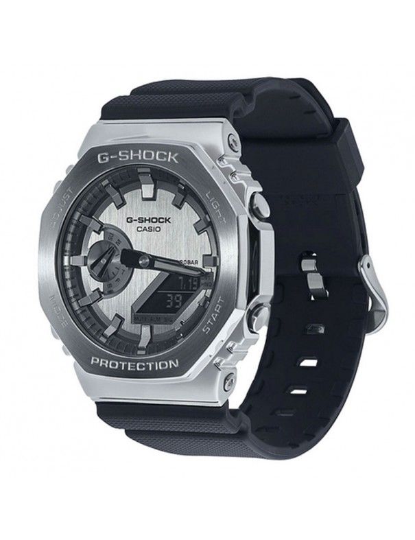 Reloj Casio G-Shock GM-2100-1AER, analógico y digital. Caja de acero reforzada con fibra de carbono de 49x44mm. Cristal mineral y correa de resina. Función de 5 alarmas, cronógrafo, formato de 12/24 horas, hora mundial. Pantalla de neón y luz led. Sumergible a 20ATM, por lo que es apto para ducha y baño con inmersión (inmersión con botella).