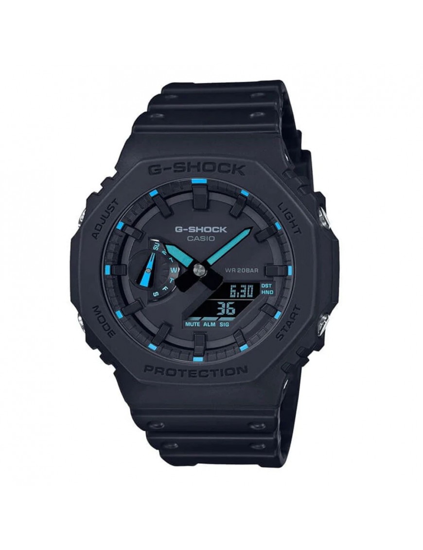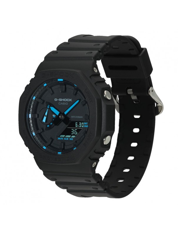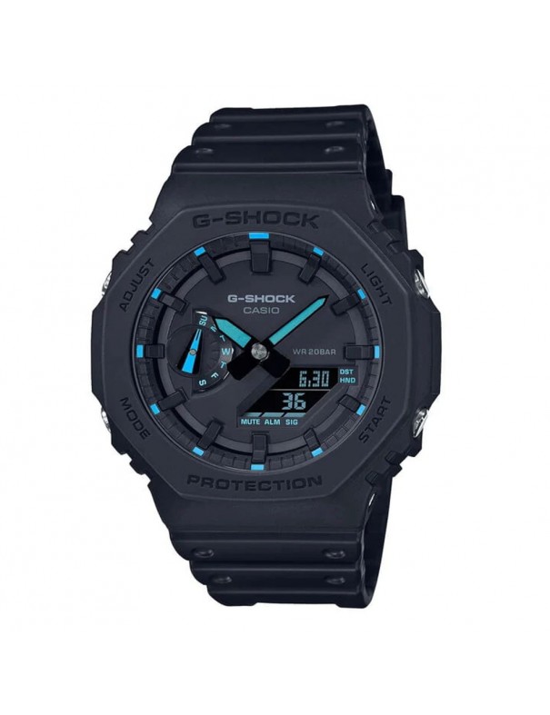 Reloj Casio G-Shock GA-2100-1A2ER, analógico digital. Caja de resina reforzada con carbono de 47mm de diámetro. Cristal mineral. Agujas e indicadores luminiscentes. Correa de resina. Pantalla de neón. Luz led. Función de cronómetro, temporizador, 5 alarmas, calendario automático, formato 12/24 horas, hora universal. Sumergible a 20ATM, por lo que es apto para ducha y baño con inmersión.