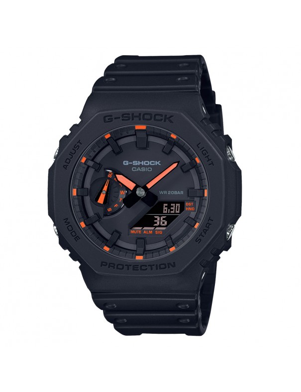Reloj Casio G-Shock GA-2100-1A4ER, analógico digital. Caja de resina reforzada con carbono de 47mm de diámetro. Cristal mineral. Agujas e indicadores luminiscentes. Correa de resina. Pantalla de neón. Luz led. Función de cronómetro, temporizador, 5 alarmas, calendario automático, formato 12/24 horas, hora universal. Sumergible a 20ATM, por lo que es apto para ducha y baño con inmersión.