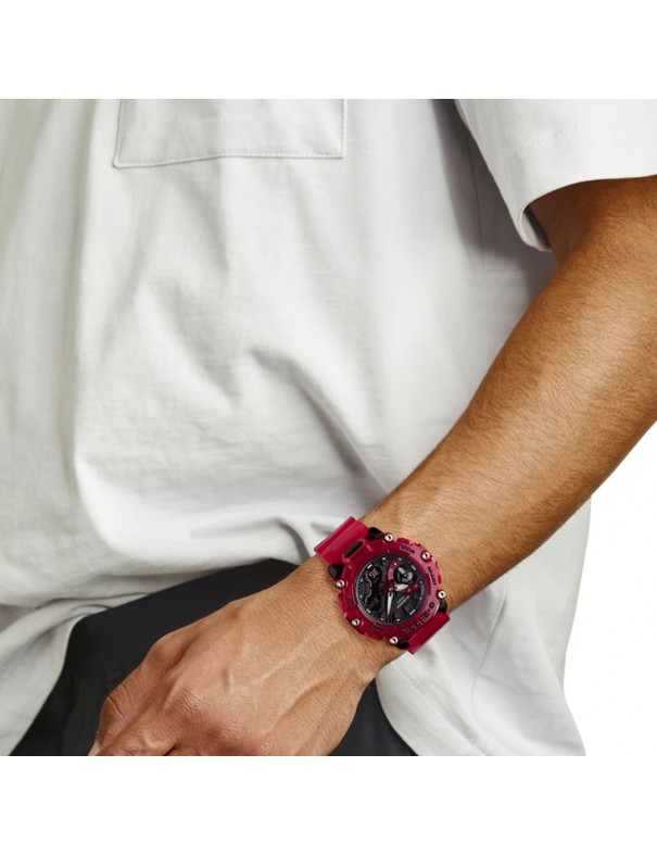Reloj Casio G-Shock GA-2200SKL-4AER, analógico y digital. Caja reforzada con fibra de carbono de 47mm de diámetro. Pulsera de resina. Cristal mineral. Agujas e indicadores luminiscentes. Función de hora universal, formato hora 12/24 horas, temporizador, 5 alarmas, cronometro, calendario automático, despertador,... Sumergible a 20ATM, por lo que es apto para ducha y baño con inmersión.
