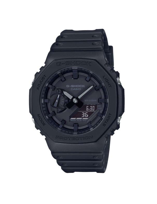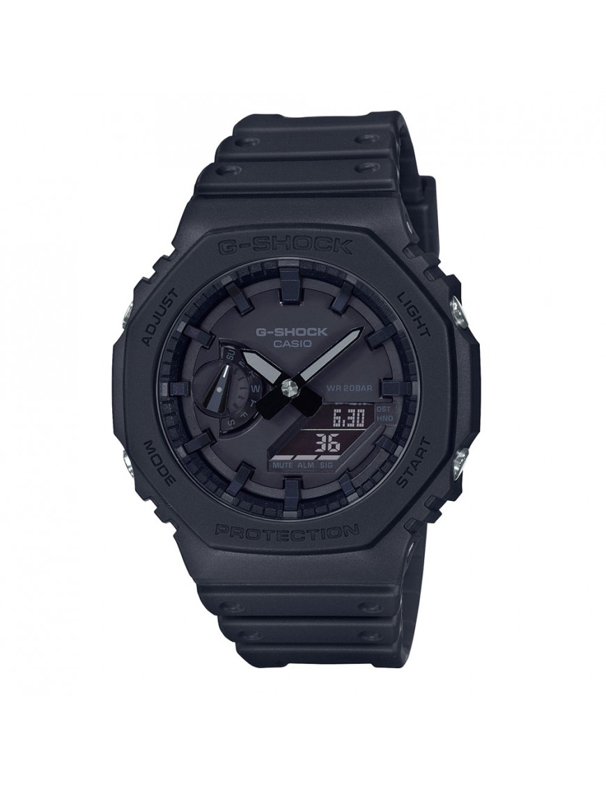 Reloj Casio G-Shock GA-2100-1A1ER, analógico y digital. Caja de resina de resina reforzada con fibra de carbono de 45mm de diámetro. Agujas luminiscentes. Cristal mineral. Pulsera de resina. Luz led. Pantalla neón. Función de calendario automático, 5 alarmas, temporizador, cronómetro, calendario automático y hora universal. Sumergible a 20ATM, por lo que es apto para ducha y baño con inmersión.