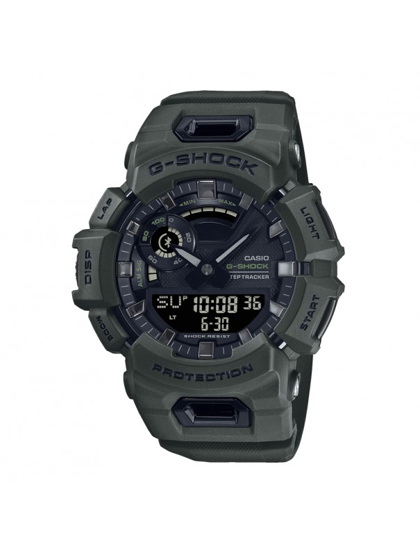 Reloj Casio G-Shock GBA-900UU-3AER. Caja de resina reforzada con carbono de 49mm de diámetro. Cristal mineral. Agujas e indicadores luminiscentes. Pantalla de neón. Luz led. Pulsera de resina. Función de 5 alarmas, temporizador, cronómetro, hora universal, calendario automático, localizador de teléfono, formato 12/24 horas, 50laps. Bluetooth Smart, el teléfono se conecta con el Smartphone de forma inalámbrica, ofreciendo numerosas funciones útilies. Sistema de energía solar, el suministro de energía de lleva a cabo a través de células solares, almacenando la energía sobrante. Sumergible a 20ATM, por lo que es apto para ducha y baño con inmersión.