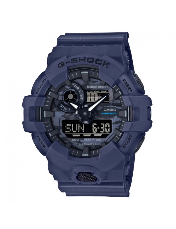 Reloj Casio G-Shock GA-700CA-2AER para hombre. La esfera es de resina antigolpes y mide 53 mm de diámetro. La hebilla es del mismo material y tiene hebilla. Cuenta con hora mundial, temporizador, cronómetro, calendario, cinco alarmas, luz led y modo 12/24 horas. Es sumergible a 20 ATM por lo que permite buceo con botella.