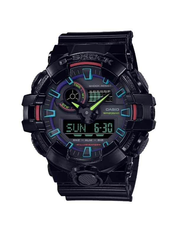Reloj Casio G-Shock Gamer GA-700RGB-1AER para hombre. La esfera del reloj es de resina y mide 53 mm de diámetro. La pulsera es del mismo material con hebilla. Entre sus funciones cuenta con calendario, modo 12/24 horas, hora mundial, cronómetro, temporizador, 5 alarmas y luz led.
