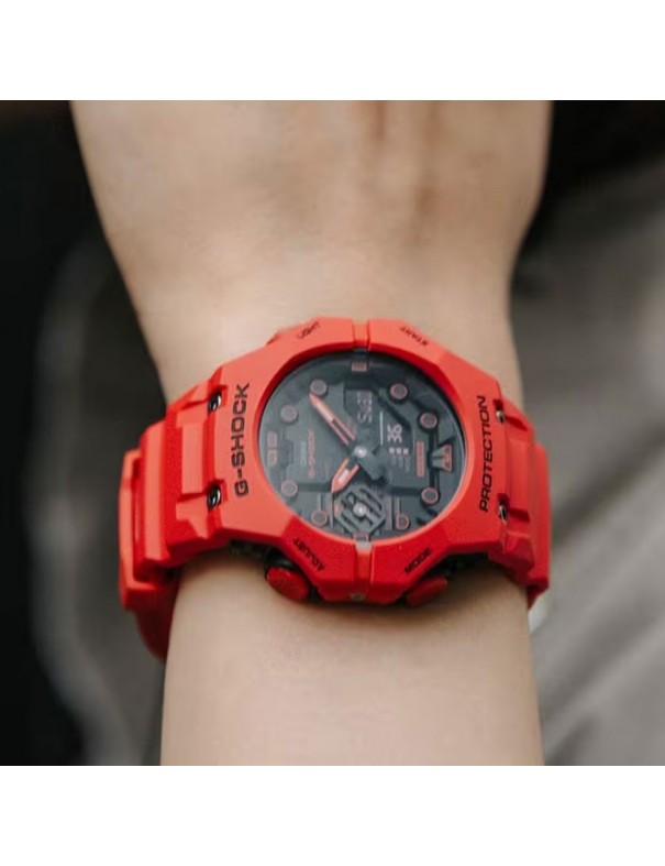 Reloj Casio G-Shock GA-B001-4AER para hombre. La esfera es de resina y carbono y mide 43 mm de diámetro. La pulsera es de resina con cierre de hebilla. Incluye funciones como Smart Mobile Link, calendario, modo 12/24 horas, hora mundial, cronómetro, temporizador, 5 alarmas y luz led. Es sumergible a 20 ATM por lo que admite buceo con botella. Garantía de tres años.