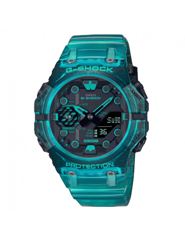 Reloj Casio G-Shock GA-B001G-2AER para hombre. La esfera es de carbono y resina y mide 46 m de diámetro. La pulsera es de resina y tiene hebilla. Incluye funciones Smart Mobile Link, calendario, formato 12/24 horas, hora mundial, cronómetro, temporizador, 5 alarmas y luz led. Es sumergible a 20 ATM por lo que que permite el buceo con botella. Garantía de tres años.
