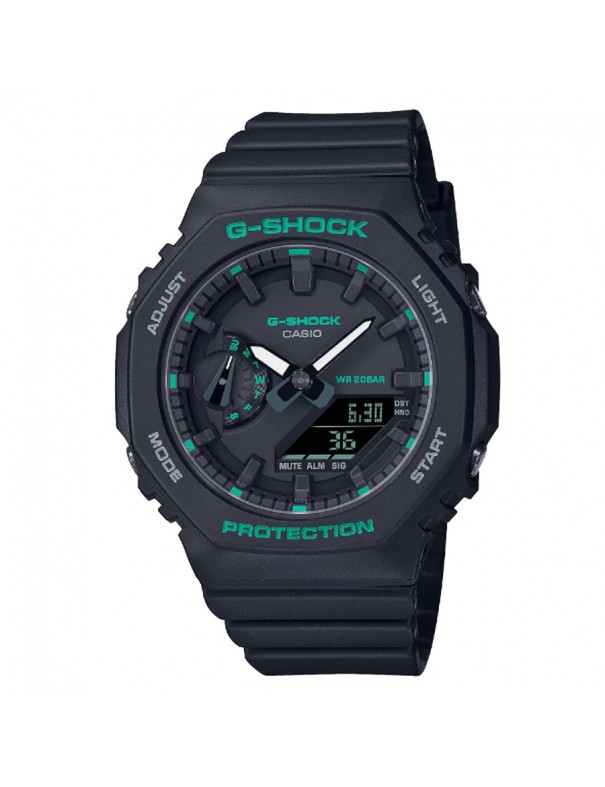 Reloj Casio G-Shock GMA-S2100GA-1AER unisex. La esfera es de carbono y resina y mide 43 mm de diámetro. La pulsera es de resina con hebilla. Incluye cronómetro, temporizador, 5 alarmas, luz led, calendario, modo 12/24 horas y hora mundial. Es sumergible a 20 ATM por lo que permite el buceo con botella. Garantía de tres años.