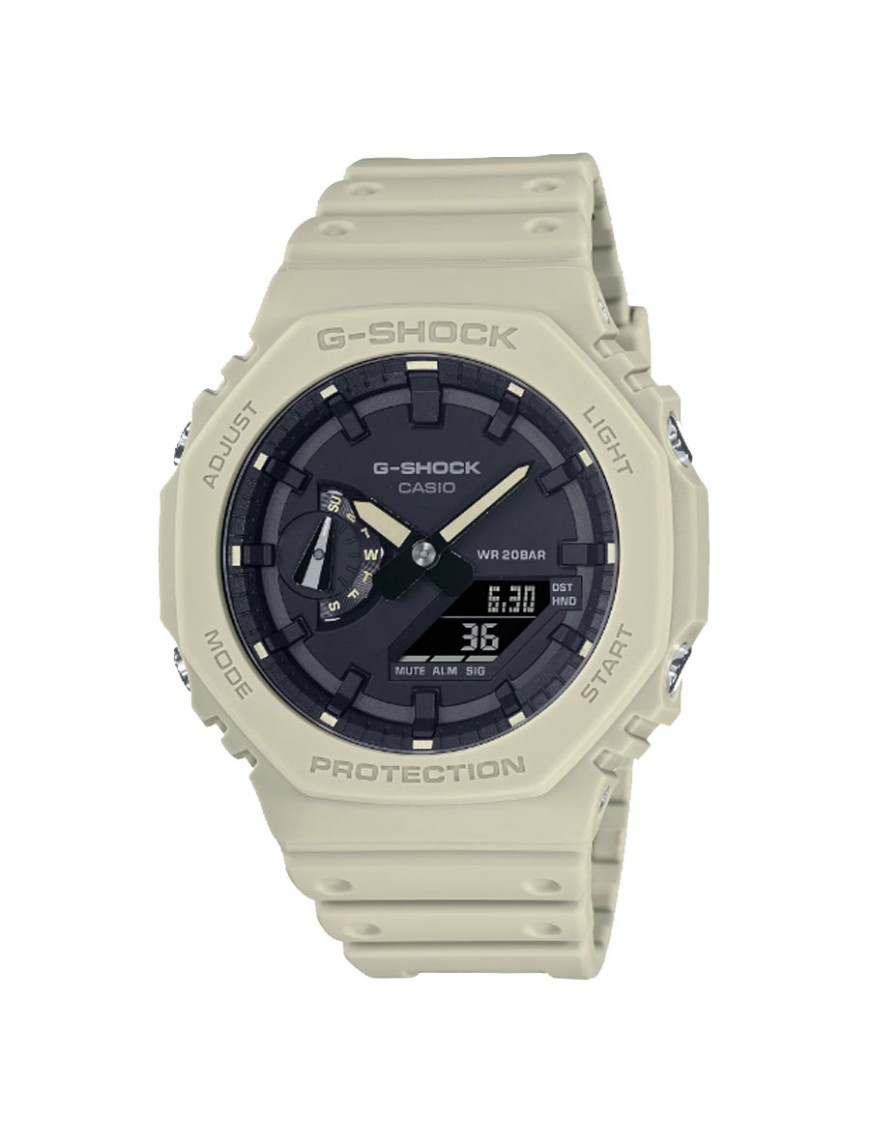 Reloj Casio G-Shock GA-2100-5AER para hombre. La esfera es de carbono y resina y mide 45 mm de diámetro. La pulsera es de resina. Cuenta con modo 12/24 horas, hora mundial, cronómetro, 5 alarmas, temporizador, luz led y calendario. Es sumergible a 20 ATM y permite el buceo con botella. Garantía de tres años.