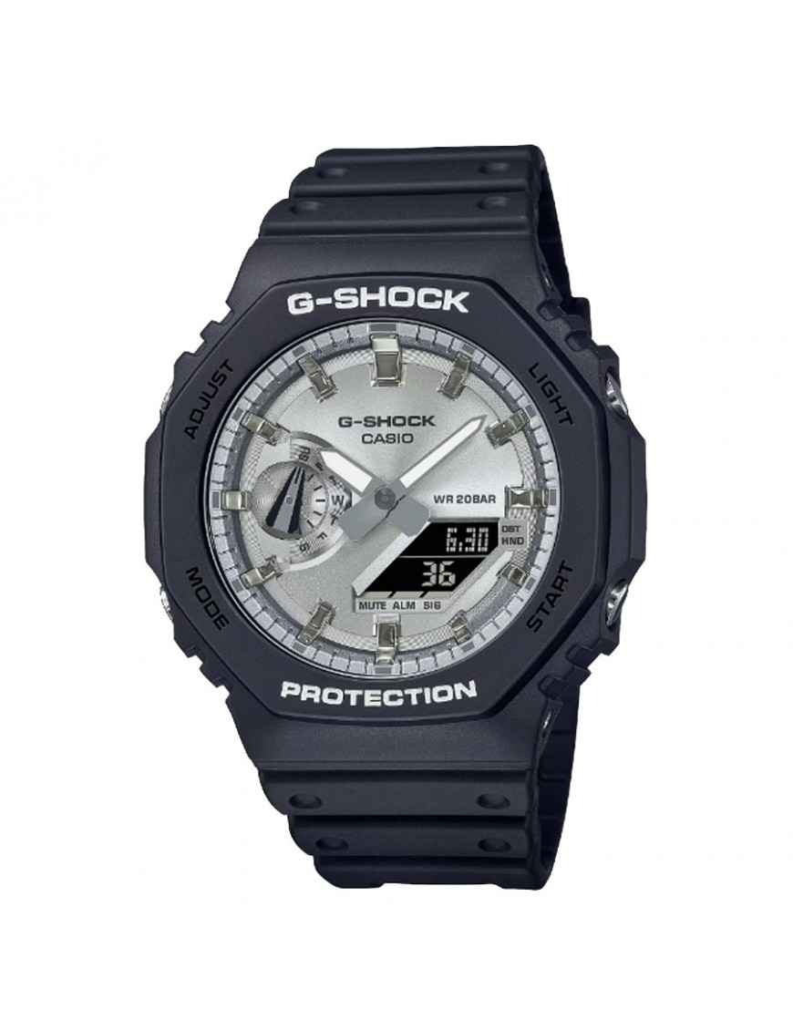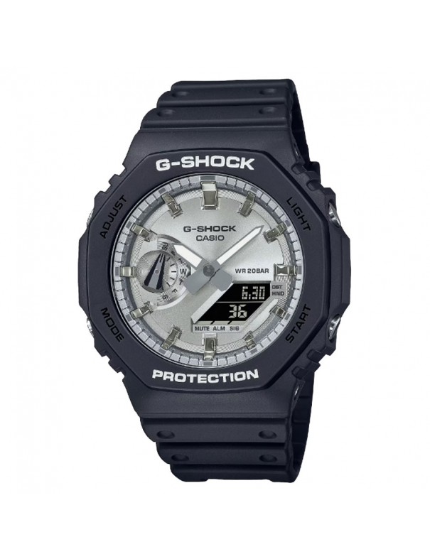 Reloj Casio G-Shock para hombre GA-2100SB-1AER. La esfera es de carbono y resina y mide 45 mm de diámetro. La pulsera es de resina con hebilla. Incluye cronógrafo, temporizador, luz led, hora mundial, 5 alarmas, calendario y modo 12/24 horas. Es sumergible a 20 ATM por lo que permite el buceo con botella. Garantía de tres años.