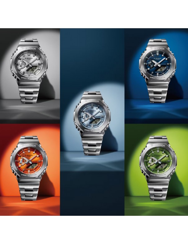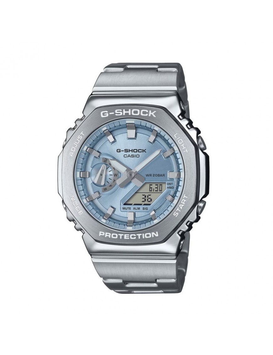 Reloj G-Shock Casio GM-2110D-2AER. Caja de acero reforzada con fibra de carbono de 44mm. Cristal mineral y correa de acero. Analógico y digital. Función de 5 alarmas, cronógrafo, formato de 12/24 horas, hora mundial. Pantalla de neón y luz led. Sumergible a 20ATM, por lo que es apto para ducha y baño con inmersión. Garantía de tres años contra defectos de fabricación.
