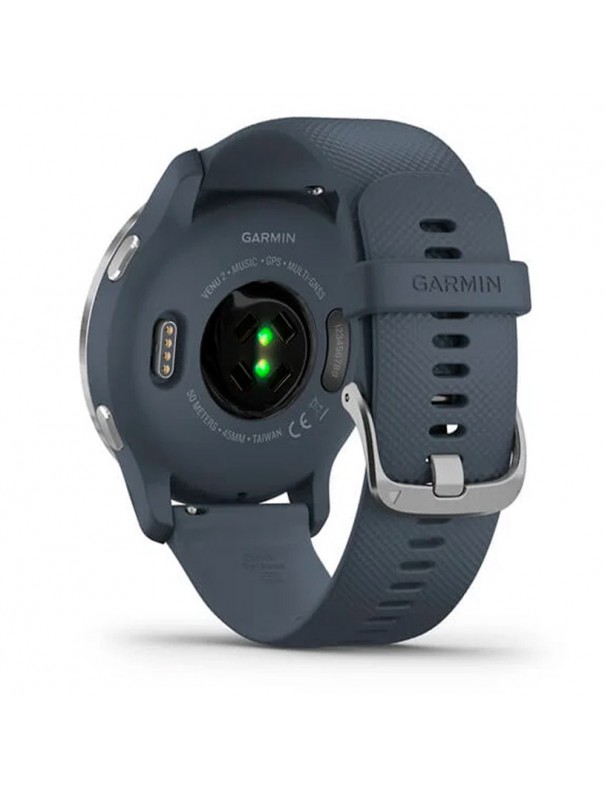 Smartwatch Garmin Venu 2 010-02430-10. Carcasa de polímero reforzado con fibra 45X45X12mm. Bisel de acero. Pantalla de 416X416 pixeles. Función de despertador, termporizador, cronómetro, frecuencia cardíaca, alerta de frecuencia anómala, saturación de oxígeno, Body Battery, recordatorio relajación, monitorización del sueño, ciclo menstrual, barómetro, acelerómetro, sensor de luz ambiental, termómetro, notificación de llamadas y mensajes, previsión del tiempo, control y reproducción de música, contador de pasos, pisos subidos, animaciones de entrenamiento, funciones de golf, calendario de caza y pesca...Duración aproximada de batería de 11 días en modo smartwatch, 8 horas con GPS y música, 22 horas con GPS sin música.