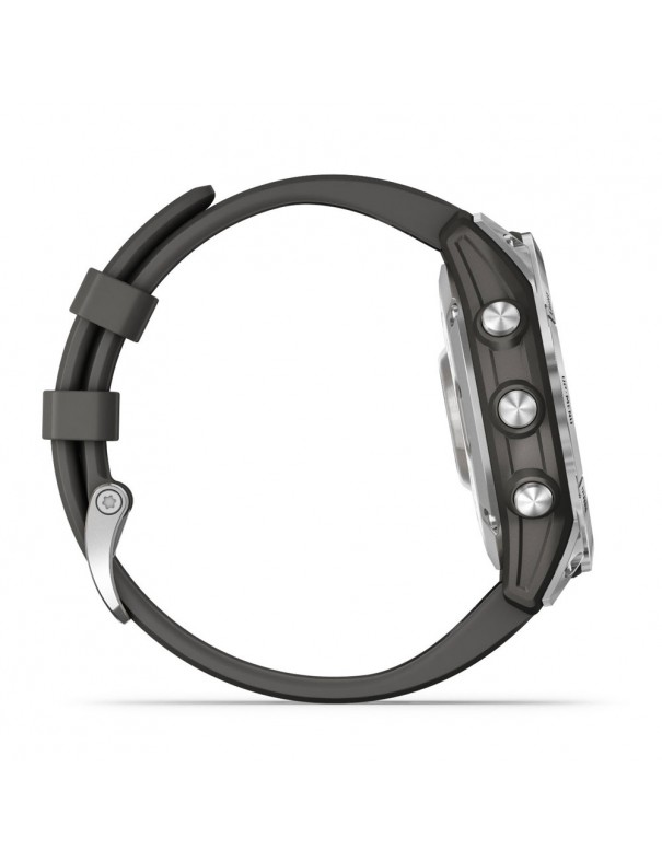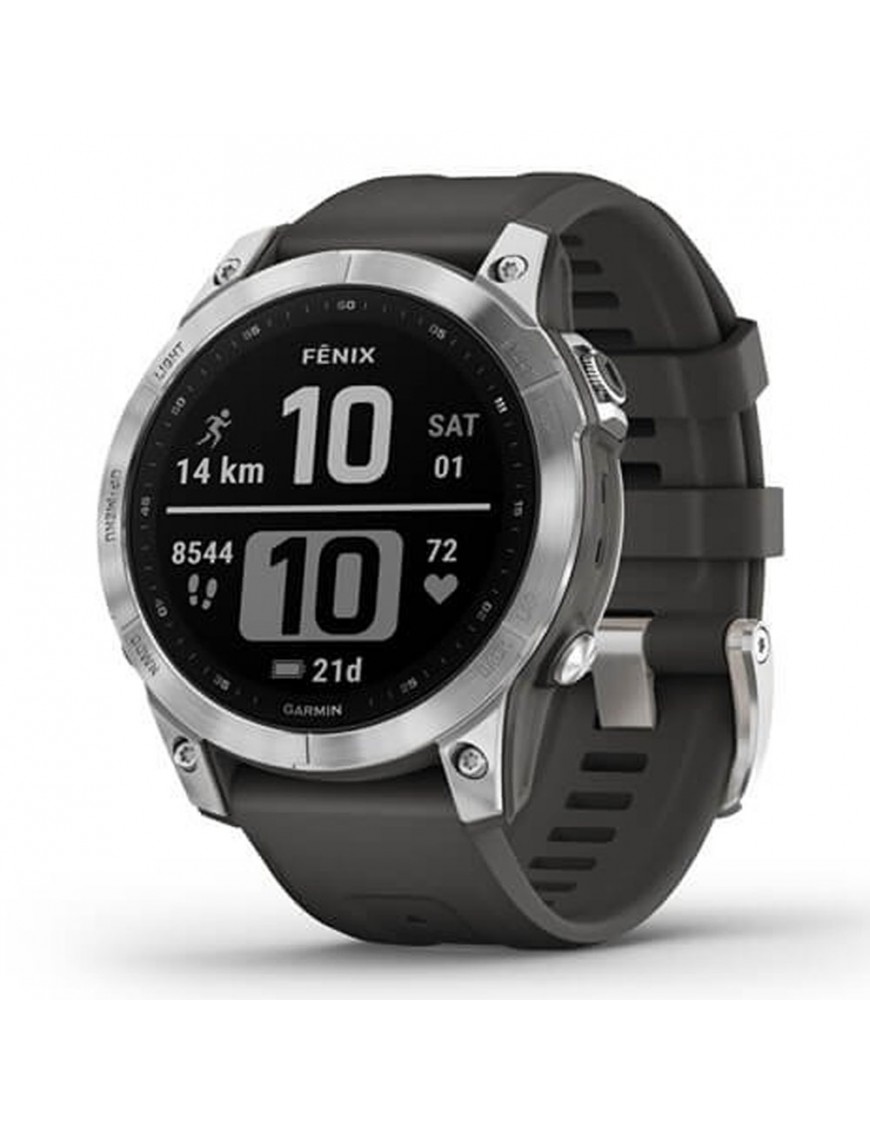 Smartwatch Garmin Fenix 7 010-02540-01. Caja de polímero reforzado con fibra de 47mm de diámetro. Bisel y tapa trasera de metal. Pantalla táctil de 260x260 píxeles. Función de despertador, temporizador, cronómetro, hora de amanecer y anochecer, monitorización de frecuencia cardíaca con aviso en caso de anomalías, tasa de respiración, Body Battery, monitor de estrés y recuerdo de relajación, seguimiento de sueño, ciclo menstrual, recordatorio de hidratación, contador de pasos y calorías, pisos subidos, GPS, GLONASS, GALILEO, altímetro, barómetro, brújula, giroscopio, acelerómetro, termómetro, previsión de tiempo, reproducción de música, notificación de llamadas y mensajes, funciones de golf, calendario de pesca y caza, natación, ejercicios de yoga, entrenamiento Pilates, tiempo de recuperación, funciones de carrera, funciones de ciclismo ... Duración de batería modo smartwatch hasta 18 días, en modo ahorro de energía hasta 57 días , modo GPS con música hasta 10 horas y modo GPS hasta 136 horas con uso máximo de batería. Sumergible a 10ATM, por lo que es apto para ducha y baño con inmersión.