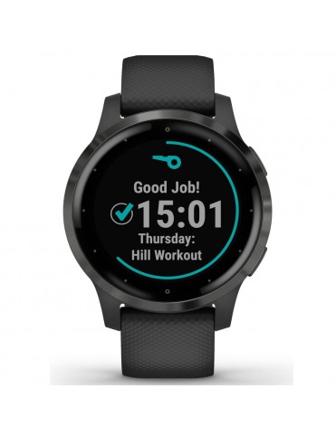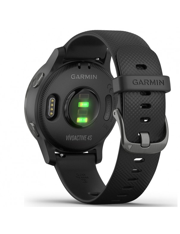 Smartwatch Garmin Vivoactive 4S 010-02172-12. Caja de polímero reforzado con fibra cubierta posterior. Diámetro de 40mm. Pantalla táctil con resolución de 218x218 píxeles. Pulsera de silicona. Duración de batería aproximada (10 días modo reloj inteligente, 5 horas modo GPS y reproducción de música). Sumergible a 5 ATM, por lo que es apto para ducha y baño sin inmersión. Función de temporizador, cronómetro, despertador, calendario, hora de amanecer y anochecer, vigilancia Body Battery, ritmo cardíaco y aviso en caso de anomalía, saturación de oxígeno en sangre, monitorización de estrés, salud femenina, contador de pasos, calorías consumidas, monitorización del sueño, hidratación, brújula, termómetro, previsión del tiempo, notificación de llamadas y mensajes, reproducción y almacenamiento de música...