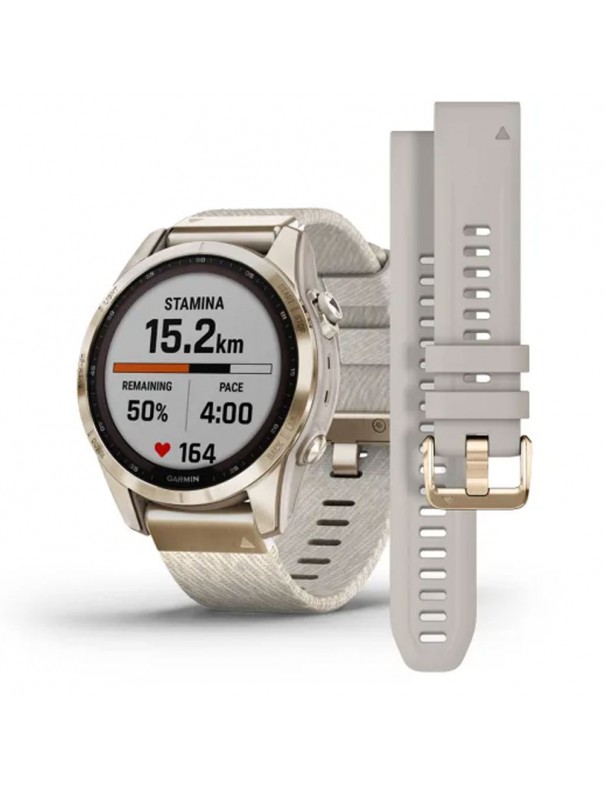 Smartwatch Fenix 7S Solar Edition 010-02539-39, caja de polímero reforzado con fibra. Bisel y tapa trasera de titanio. Diámetro de 42mm. Lente Power Sapphire. Resolución de pantalla de 240x240 píxeles visible a la luz del sol, transflectiva. Presenta doble correa de silicona y ante con silicona. Sumergible a 10ATM, por lo que es apto para ducha y baño con inmersión. Duración de batería hasta 14 días reloj inteligente con función de carga solar. Hasta 87 con modo ahorro de energía. Función de hora, despertador, temporizador, cronómetro, hora de anochecer y amanecer. Medición de frecuencia cardíaca con aviso de anomalía, saturación de oxígeno en sangre, monitor de estrés, calorías consumidas, contador de pasos, seguimiento de sueño, recordatorio de hidratación y sedentarismo, Health Snapson, seguimiento de salud femenina, GPS, Galileo, Glonass, altímetro, barómetro, giroscopio, acelerómetro, termómetro, aclimatación por pulsioximetría, notificación de llamadas y notificaciones inteligentes, calendario, previsión de tiempo control y reproducción de música, almacenamiento de música, coordinadas de cuadrícula doble, diferentes modos de deporte.