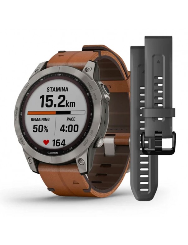 Smartwatch Fenix 7S Solar Edition 010-02539-39, caja de polímero reforzado con fibra. Bisel y tapa trasera de titanio. Diámetro de 47mm. Lente Power Sapphire. Resolución de pantalla de 240x240 píxeles visible a la luz del sol, transflectiva. Presenta doble correa de silicona y ante con silicona. Sumergible a 10ATM, por lo que es apto para ducha y baño con inmersión. Duración de batería hasta 14 días reloj inteligente con función de carga solar. Hasta 87 con modo ahorro de energía. Función de hora, despertador, temporizador, cronómetro, hora de anochecer y amanecer. Medición de frecuencia cardíaca con aviso de anomalía, saturación de oxígeno en sangre, monitor de estrés, calorías consumidas, contador de pasos, seguimiento de sueño, recordatorio de hidratación y sedentarismo, Health Snapson, seguimiento de salud femenina, GPS, Galileo, Glonass, altímetro, barómetro, giroscopio, acelerómetro, termómetro, aclimatación por pulsioximetría, notificación de llamadas y notificaciones inteligentes, calendario, previsión de tiempo control y reproducción de música, almacenamiento de música, coordinadas de cuadrícula doble, diferentes modos de deporte.