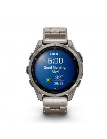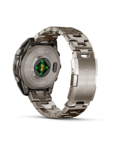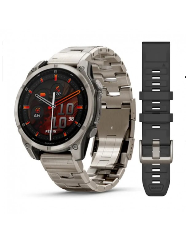 Smartwatch Fenix 8 Amoled 010-02904-40. Caja de titanio de 47mm de diámetro y correa del mismo material, incluye una correa adicional de silicona. Pantalla amoled con una resolución de alta definición y cristal de zafiro resistente a los arañazos. Sistema de GPS avanzado, navegación precisa con multiples sistemas satelitales ( GPS, GLONASS, Galileo), funciones de ruta y navegación. Cambien cuenta con más de 30 modos deportivos preinstalados, incluyendo triatlón, senderismo esquí y más. Monitor de salud integral: frecuencia cardíaca en la muñeca, medición de oxigeno en sangre y analisis del sueño. Funciones de conectividad: Notificaciones de llamadas, mensajes, etc y sincronización con la app Garmin Connect. Duracion de la batería: hasta 16 días en modo smartwatch y hasta 37 horas en modo GPS siempre activo. Resistente al agua 10 ATM (permite actividades como natación o snorkel)