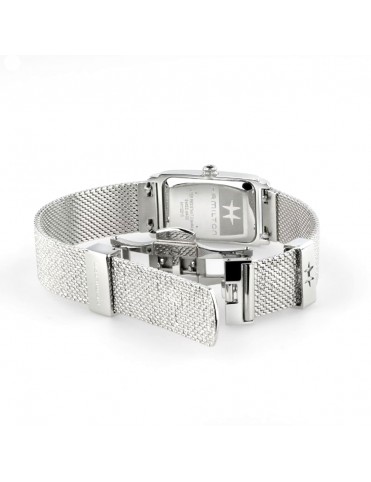 Reloj Hamilton American Classic Ardmore Small H11221150. Caja de acero inoxidable pulido con forma rectangular de estilo art-déco, esfera plateada con números romanos negros y pequeño segundero a las 6; brazalete de acero con cierre desplegable de mariposa; movimiento de cuarzo suizo. Sumergible hasta 3 bar. Garantía de 3 años.