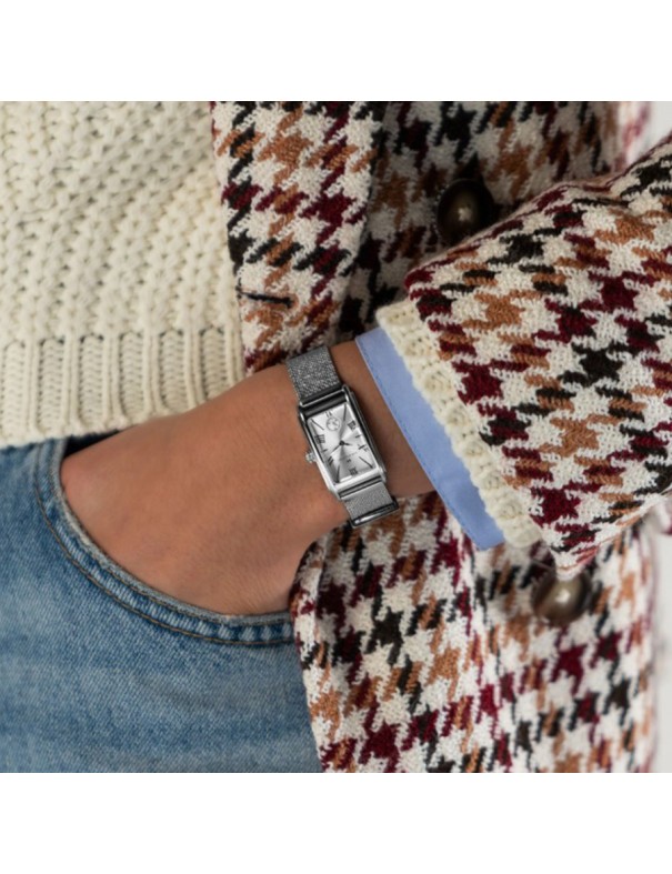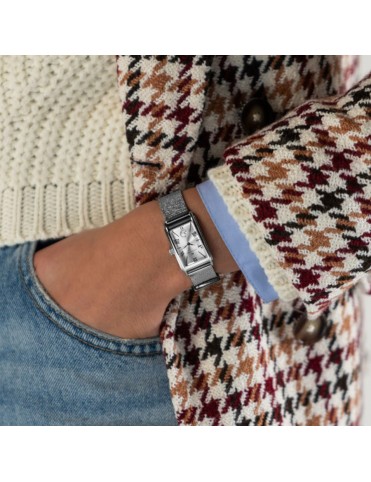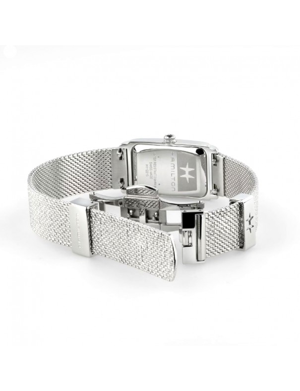 Reloj Hamilton American Classic Ardmore Small H11221150. Caja de acero inoxidable pulido con forma rectangular de estilo art-déco, esfera plateada con números romanos negros y pequeño segundero a las 6; brazalete de acero con cierre desplegable de mariposa; movimiento de cuarzo suizo. Sumergible hasta 3 bar.