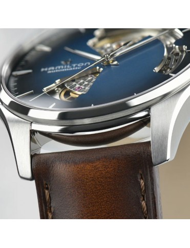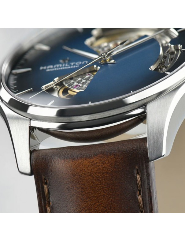 Reloj Hamilton Jazzmaster Open Heart Auto H32675540. Caja de acero inoxidable de 40 mm con esfera azul ahumada “open heart” que deja ver parte del movimiento. Cuenta con una correa de piel marrón con cierre de hebilla estándar; movimiento automático suizo con reserva de marcha de 80 horas. Sumergible hasta 5 bar.