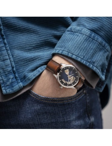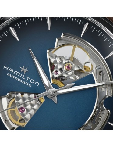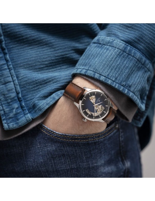 Reloj Hamilton Jazzmaster Open Heart Auto H32675540. Caja de acero inoxidable de 40 mm con esfera azul ahumada “open heart” que deja ver parte del movimiento. Cuenta con una correa de piel marrón con cierre de hebilla estándar; movimiento automático suizo con reserva de marcha de 80 horas. Sumergible hasta 5 bar. Garantía de 3 años.