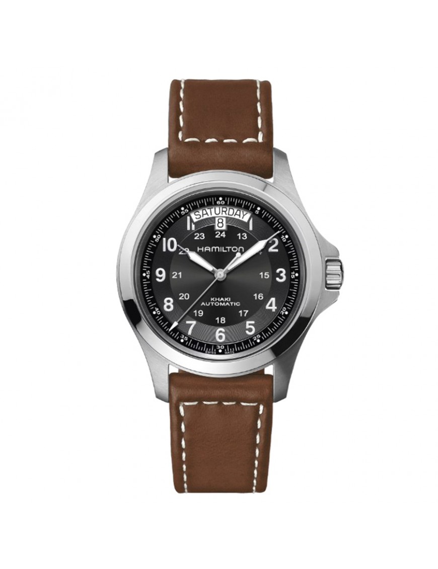 Reloj Hamilton Khaki Field King Auto H64455533. Caja de acero inoxidable plateado con esfera negra, correa de piel marrón con cierre de hebilla. Movimiento automático H-40 con 80 horas de reserva, día y fecha a las 12 en punto. Cristal de zafiro y fondo transparente. Resistente al agua hasta 5 bar. Garantía de 3 años.