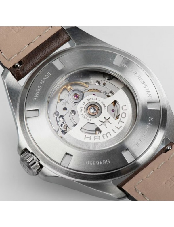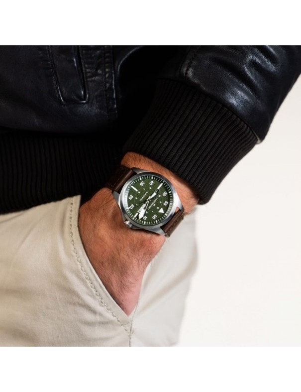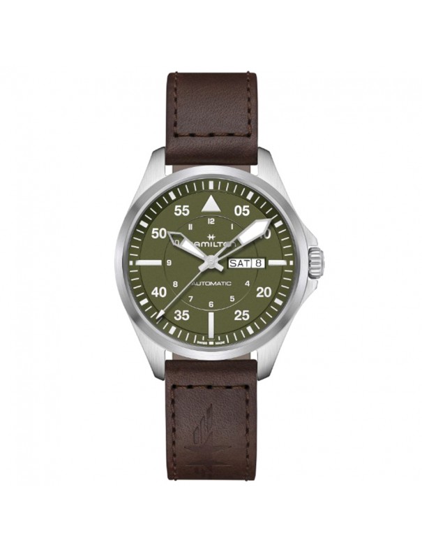 Reloj Hamilton Khaki Aviation Pilot Day Date Auto H64635560. Reloj con caja de acero inoxidable, esfera verde oliva, correa de piel marrón oscuro con cierre tipo hebilla. Movimiento automático calibre H-30 con función día/fecha y reserva de marcha de 80 h. Cristal de zafiro, fondo visto y resorte Nivachron™. Sumergible hasta 10 bar. Garantía de 3 años.