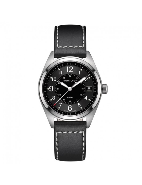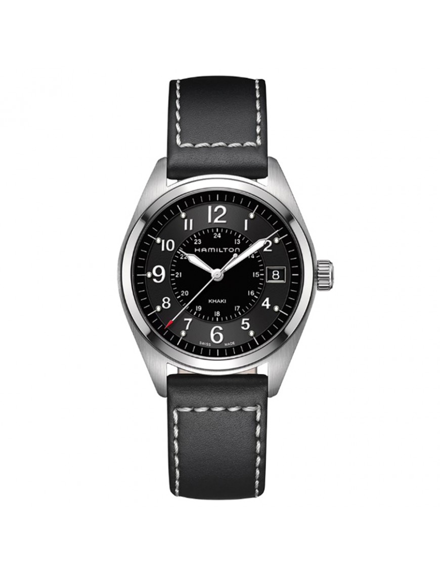 Reloj Hamilton Khaki Field Quartz H68551733. Reloj con caja de acero inoxidable plateado y esfera negra, con correa de cuero negro y cierre de hebilla. Monta un movimiento cuarzo ETA F07.111 con función de fecha a las 3. Cristal de zafiro anti rayaduras y resistencia al agua hasta 5 bares. Garantía de 3 años.