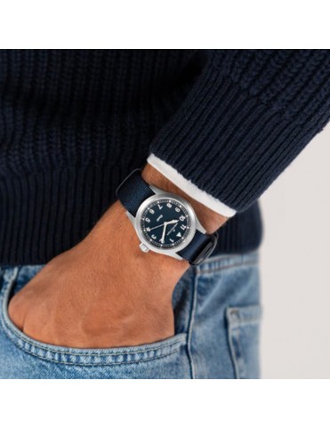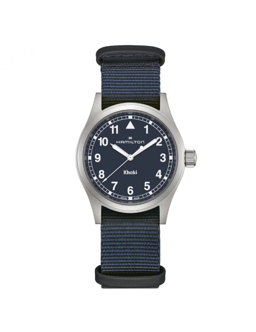 Reloj Hamilton Khaki Field Quartz 38mm H69401940. Caja de acero inoxidable plateado y esfera azul, equipado con correa NATO textil azul con detalles de piel y cierre de hebilla. Monta un movimiento cuarzo suizo con funciones de horas, minutos y segundos. Cristal de zafiro resistente y resistencia al agua de hasta 5 bares.