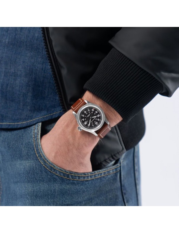 Reloj Hamilton Khaki Field Auto H70455533. Caja de acero inoxidable de 38 mm y esfera negra, montado sobre una correa de cuero marrón con cierre de hebilla. Dispone de movimiento automático calibre H‑10 con reserva de marcha de 80 h, función de fecha y segundero. Cristal de zafiro resistente y sumergible hasta 10 bares. Garantía de 3 años.