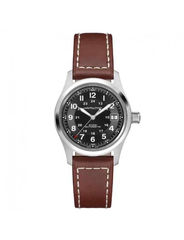 Reloj Hamilton Khaki Field Auto H70455533. Caja de acero inoxidable de 38 mm y esfera negra, montado sobre una correa de cuero marrón con cierre de hebilla. Dispone de movimiento automático calibre H‑10 con reserva de marcha de 80 h, función de fecha y segundero. Cristal de zafiro resistente y sumergible hasta 10 bares.