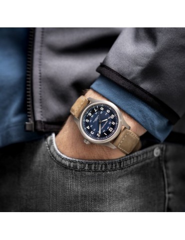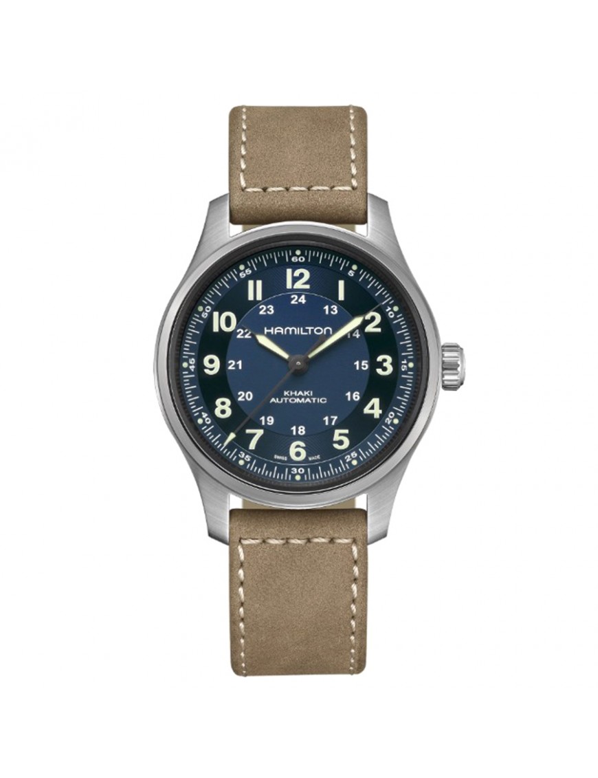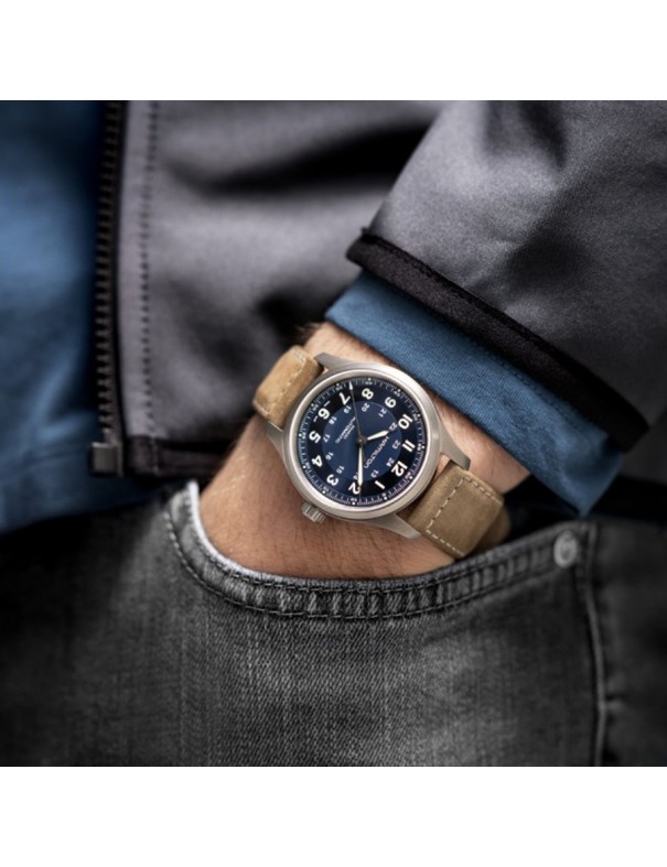 Reloj Hamilton Khaki Field Titanium Auto H70545540. Caja de titanio muy ligera, esfera de color azul, correa de cuero marrón con cierre de hebilla, y mecanismo automático calibre H‑10 con 80 h de reserva. Cuenta con resistente cristal de zafiro. Sumergible hasta 10 bares. Garantía de 3 años.