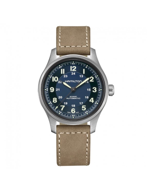 Reloj Hamilton Khaki Field Titanium Auto H70545540. Caja de titanio muy ligera, esfera de color azul, correa de cuero marrón con cierre de hebilla, y mecanismo automático calibre H‑10 con 80 h de reserva. Cuenta con resistente cristal de zafiro. Sumergible hasta 10 bares.