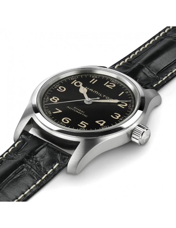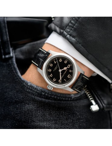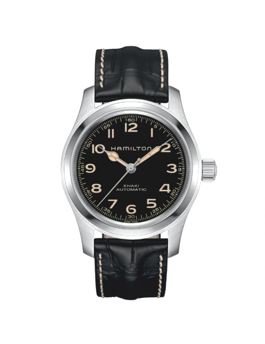 Reloj Hamilton Khaki Field Murph Auto H70605731. Caja de acero inoxidable, esfera negra; correa de piel de becerro negra con cierre de hebilla; movimiento automático calibre H-10 con 80 horas de reserva y segundero con “Eureka” en morse; resistente al agua hasta 10 bar. Garantía de 3 años.