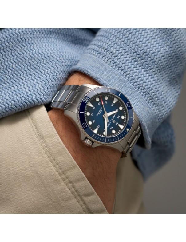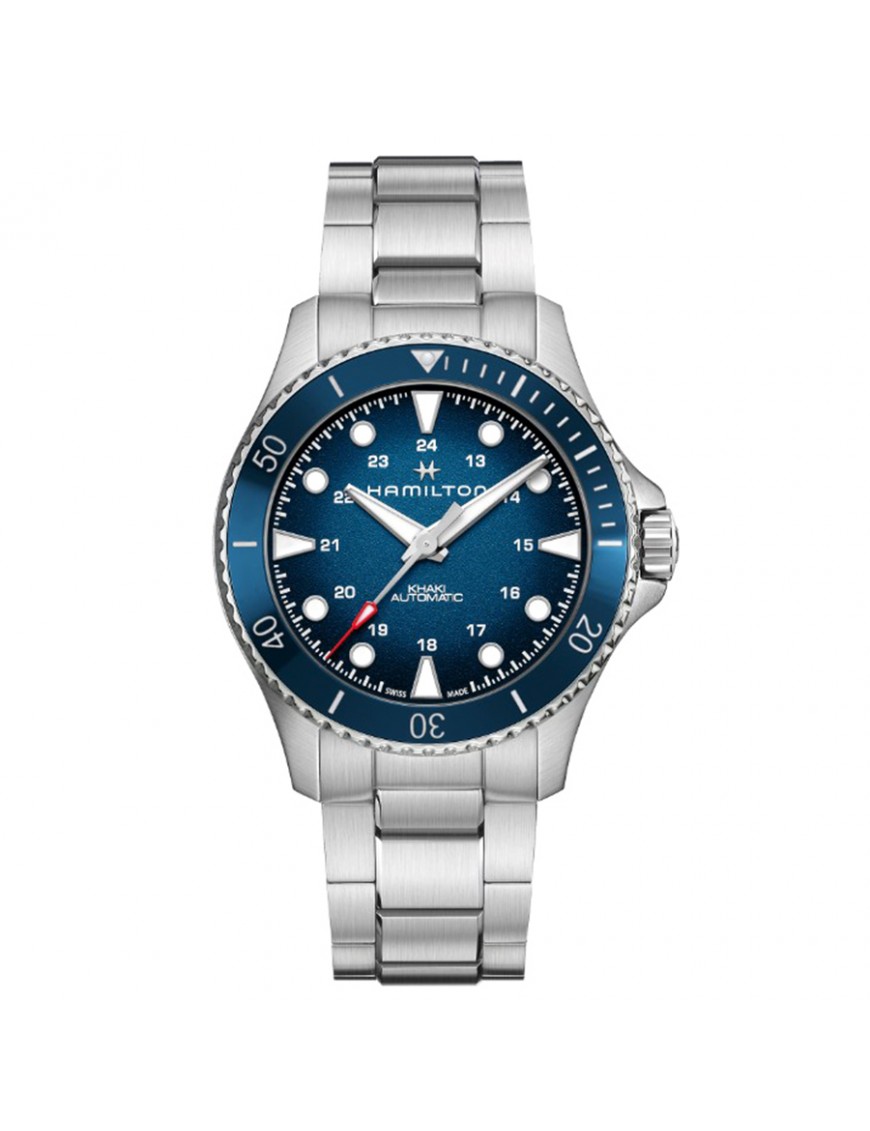 Reloj Hamilton Khaki Navy Scuba Auto H82505140. Caja de acero inoxidable de 43 mm, esfera azul y bisel cerámico; brazalete de acero con cierre desplegable; movimiento automático H-10 con 80 h de reserva; funciones de hora, minutos y segundos con Super-LumiNova; resistente hasta 30 bares.
