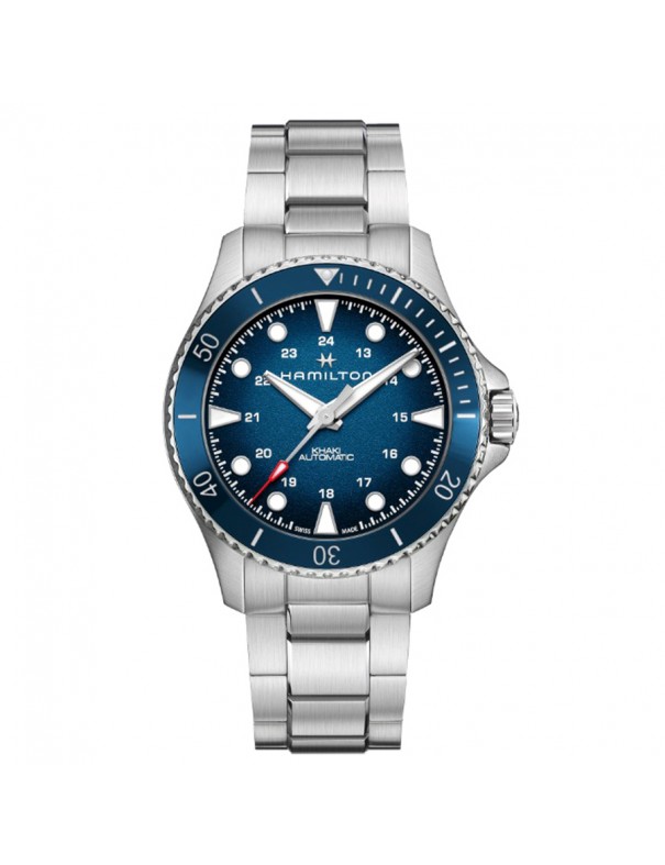 Reloj Hamilton Khaki Navy Scuba Auto H82505140. Caja de acero inoxidable de 43 mm, esfera azul y bisel cerámico; brazalete de acero con cierre desplegable; movimiento automático H-10 con 80 h de reserva; funciones de hora, minutos y segundos con Super-LumiNova; resistente hasta 30 bares. Garantía de 3 años.