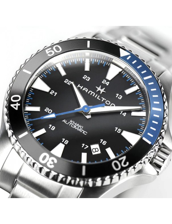 Reloj Hamilton Khaki Navy Scuba Auto H82315131. Caja de acero inoxidable, esfera negra, brazalete de acero, cierre desplegable con pulsadores; movimiento automático calibre H-10 con reserva de marcha de 80 h y fecha. Resistente al agua hasta 10 bar. Garantía de 3 años.