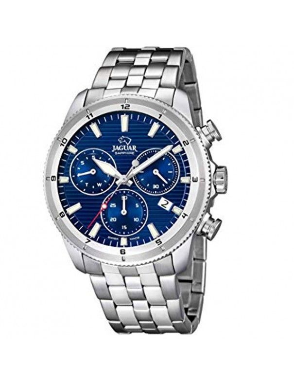 Reloj Jaguar Hombre multifunción J687/A. Es un reloj original de la marca Jaguar. Es un modelo analógico multifunción, con calendario a las 4 horas. Su mecanismo es de cuarzo alimentado con pila. La caja que encierra al mecanismo es de acero hipoalergénico e inoxidable, terminado en color plateada. Tiene un diámetro de 43.5 milímetros y es sumergible a 100 metros de profundidad, 10 ATM. Un cristal de zafiro cubre a la esfera, la cual es de color azul. Los indicadores horarios son índices lumiscentes color plata. A su vez, la correa es de acero inoxidable, con cierre deployante. Somos distribuidores oficiales de los relojes Jaguar que ofrecen una garantía de 2 años contra defectos de fabricación. Todos nuestros pedidos se envían con envoltorio especial de regalo y en sus cajas originales. Disponemos de servicio de grabación totalmente gratuito.