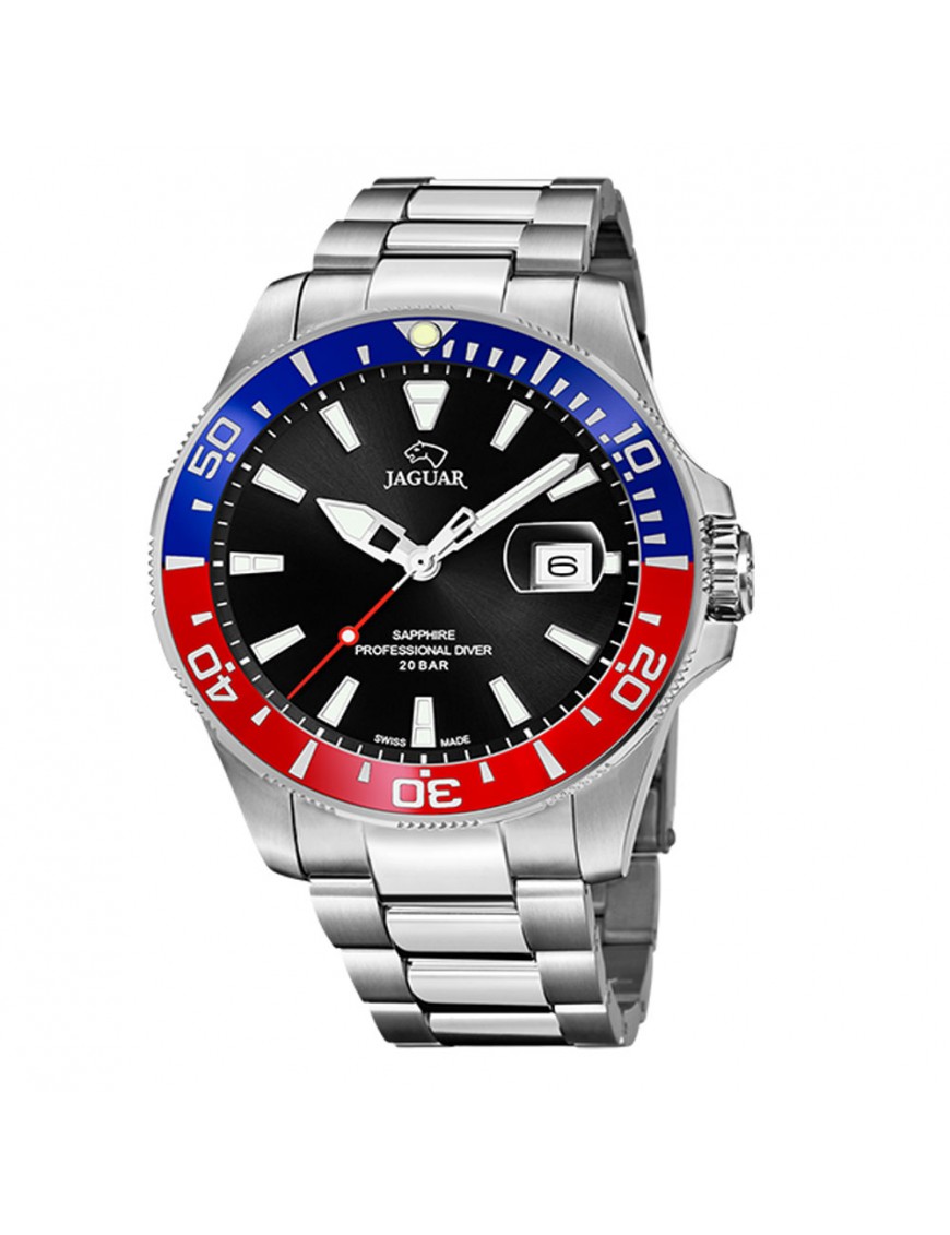 Reloj Jaguar Hombre J860/F, analógico de tres agujas Swiss Made. Caja de acero de 43.5mm de diámetro. Bisel bicolor rojo y azul. Cristal de zafiro. Pulsera de acero. Agujas e indicadores luminiscentes. Sumergible a 20ATM, por lo que es apto para inmersión.